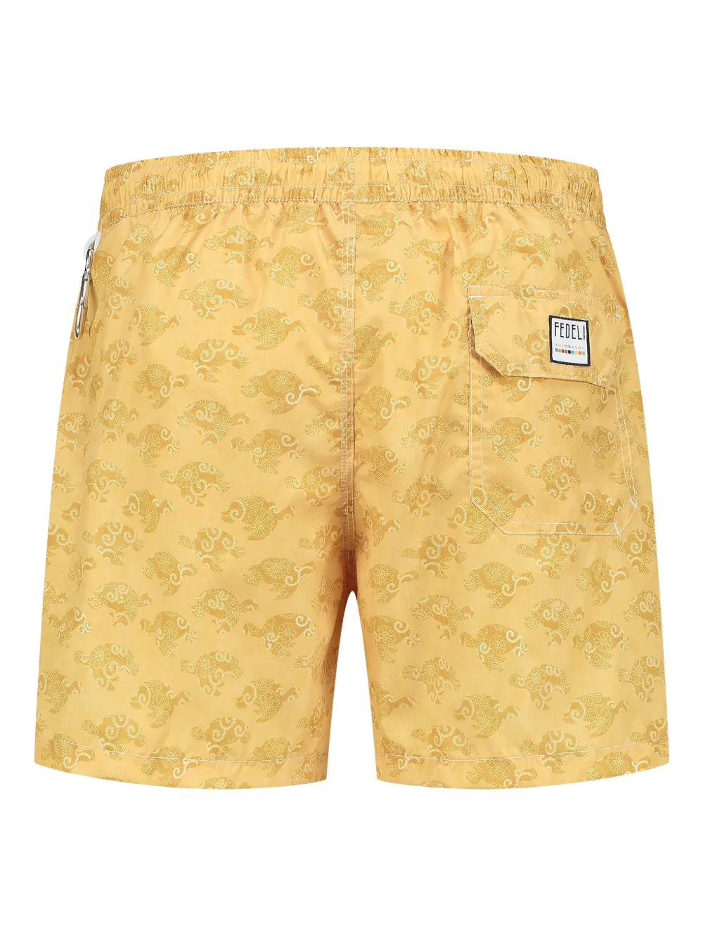 geel elastische tailleband met trekkoord klepzak achter logopatch aan de achterkant Zwemkleding moet over je eigen kleding worden aangepast.