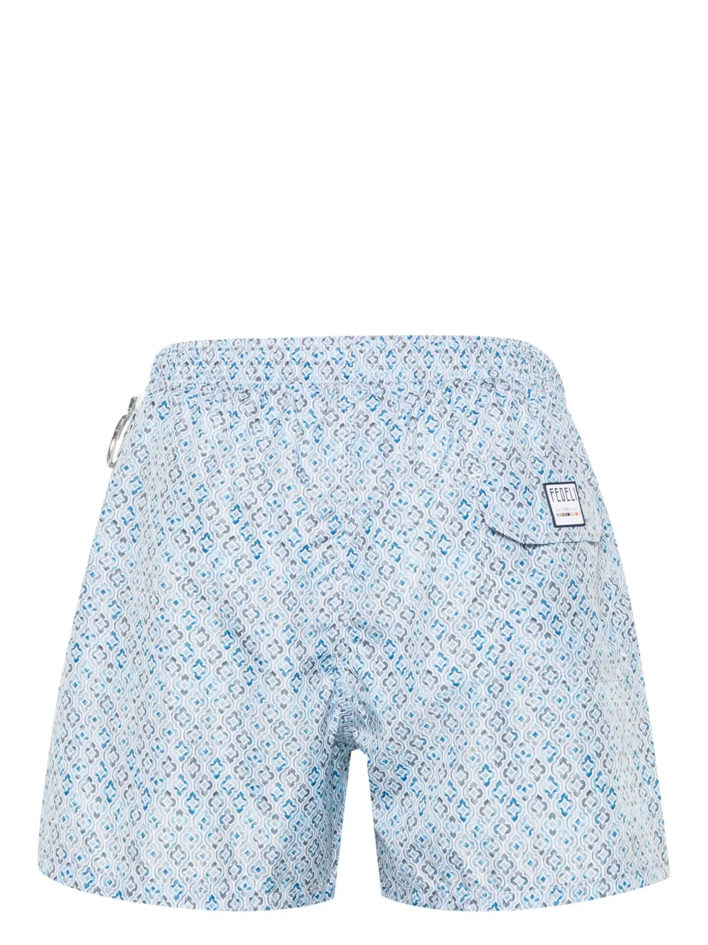 blauw/wit gerecycled polyester getextureerde afwerking all-over geometrisch geborduurd patroon elastische tailleband twee paspelzakken aan de zijkant korte zijsplitten visvormig haakdetail klepzak aan de achterzijde logopatch aan de achterkant gedeeltelijk gevoerd dijlengte trekkoordtaille Zwemkleding moet over je eigen kleding worden aangepast.