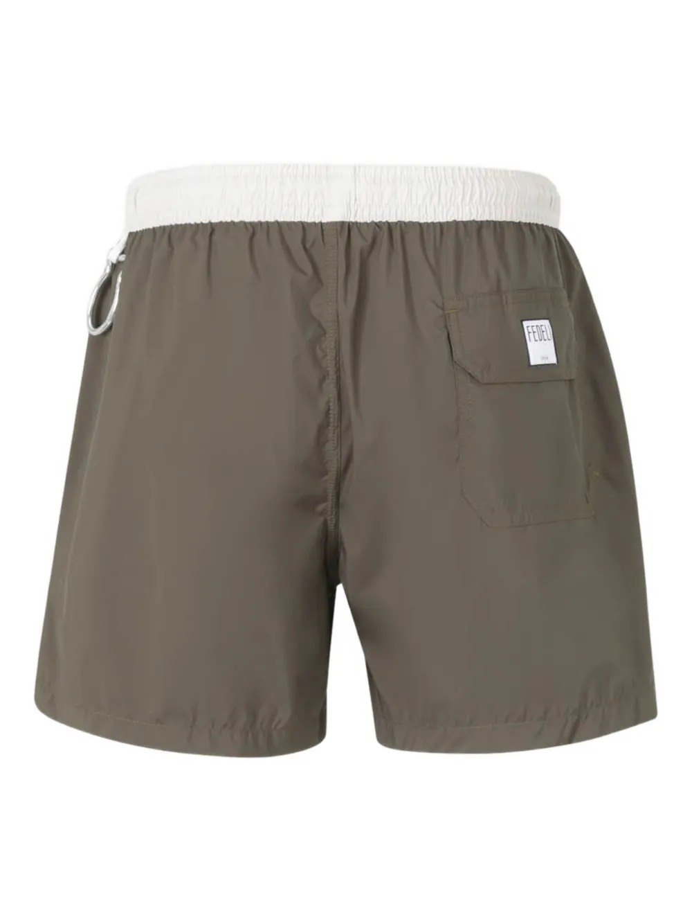olijfgroen elastische tailleband met trekkoord twee ingenaaide zijzakken klepzak aan de achterkant Zwemkleding moet over je eigen kleding worden aangepast.