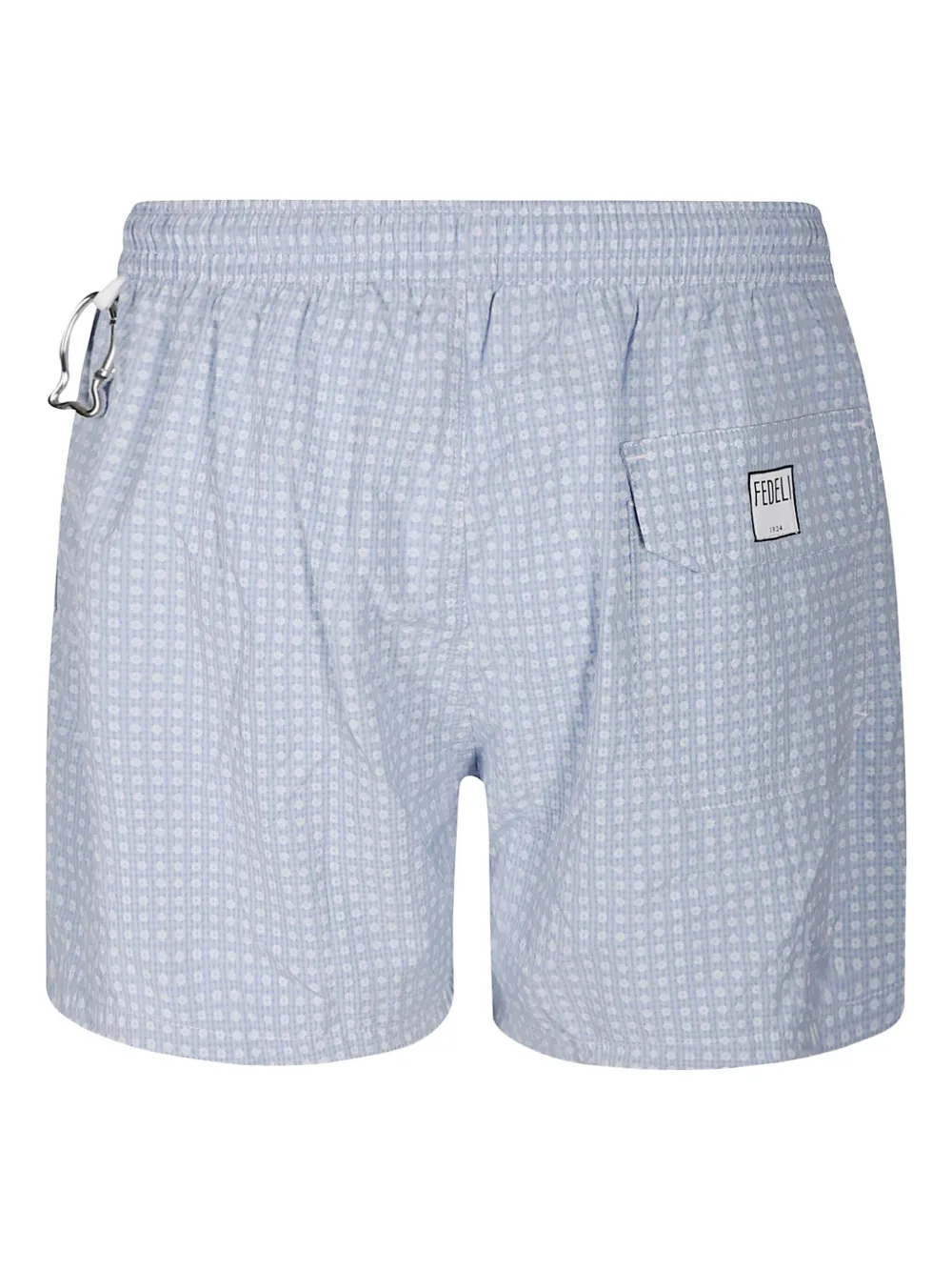 lichtblauw geometrisch patroon trekkoordsluiting zijzakken logopatch elastische tailleband Zwemkleding moet over je eigen kleding worden aangepast.