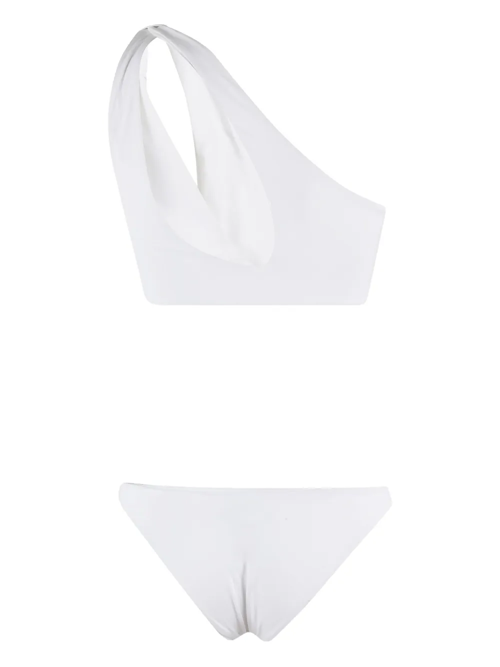 wit asymmetrisch design uitgesneden detailGedraaide top bijpassende bikinislip minimalistisch design Zwemkleding moet over je eigen kleding worden aangepast.
