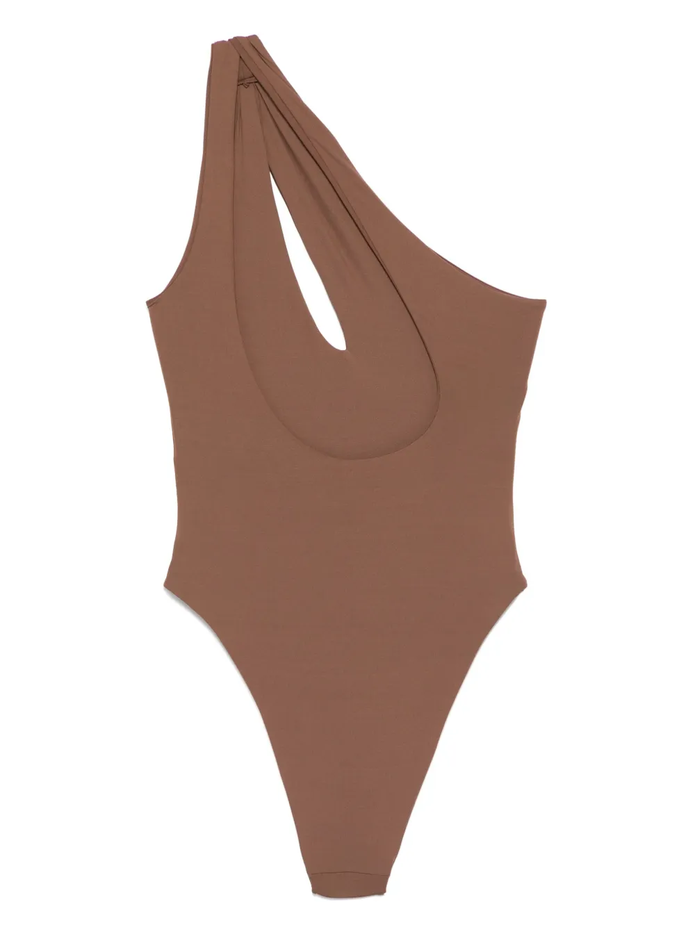 chocoladebruin enkele schouder geknoopt detail Zwemkleding moet over je eigen kleding worden aangepast.