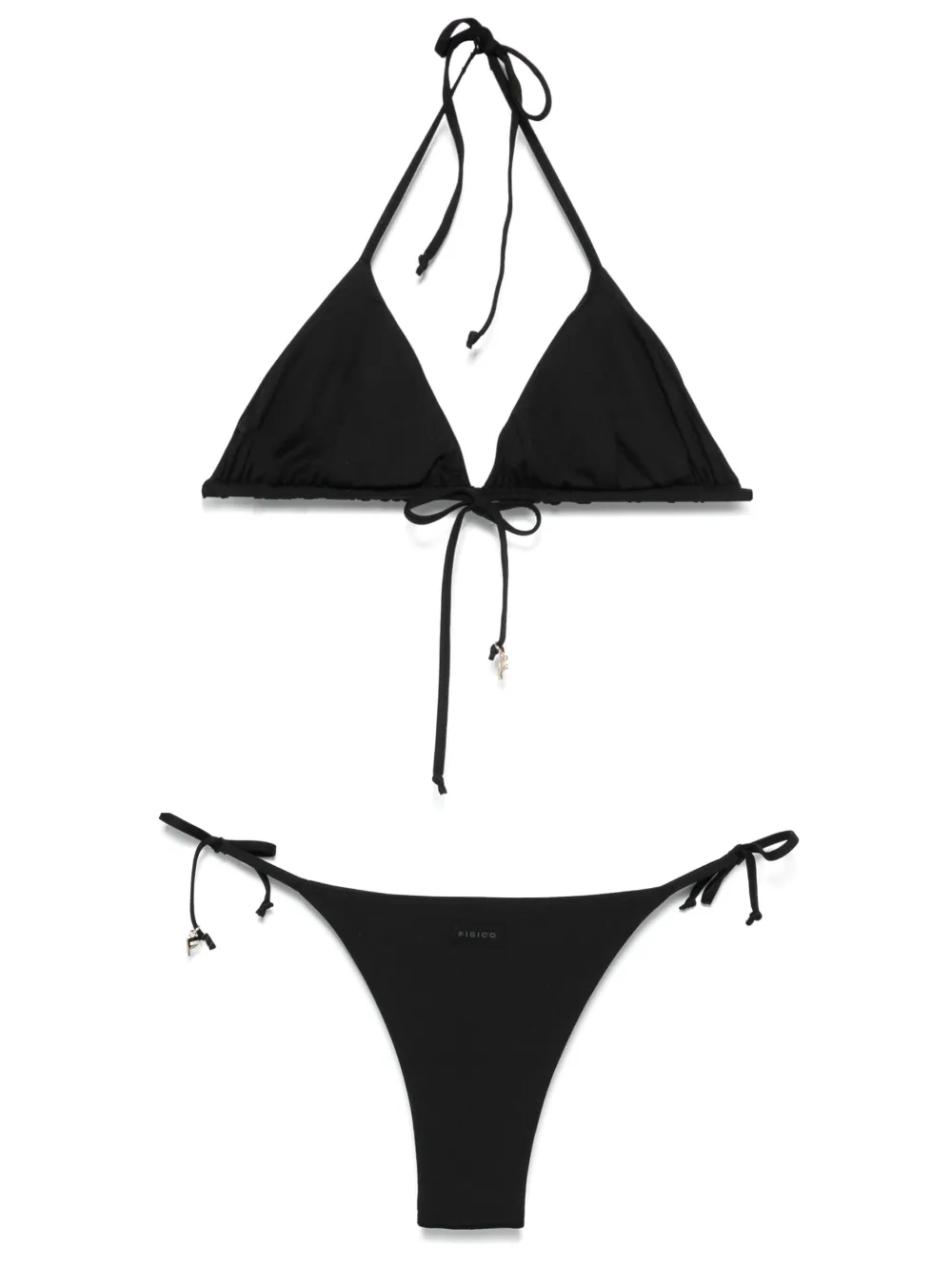 zwart halternek striksluiting bikinibroek met striksluiting aan de zijkant logo bedel Zwemkleding moet over je eigen kleding worden aangepast.