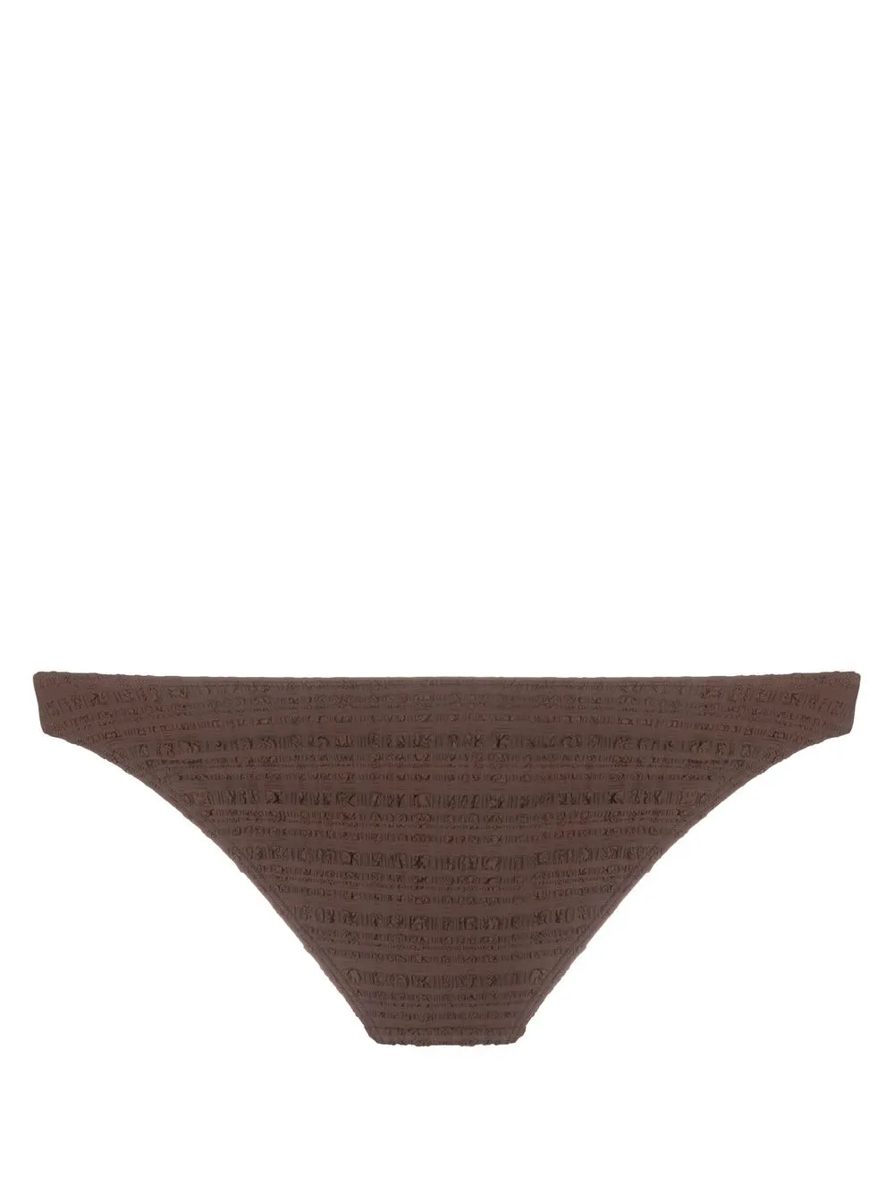 Koffiebruin, stretch design, instapmodel, getextureerde afwerking en hoog uitgesneden. Zwemkleding moet over je eigen kleding worden aangepast..