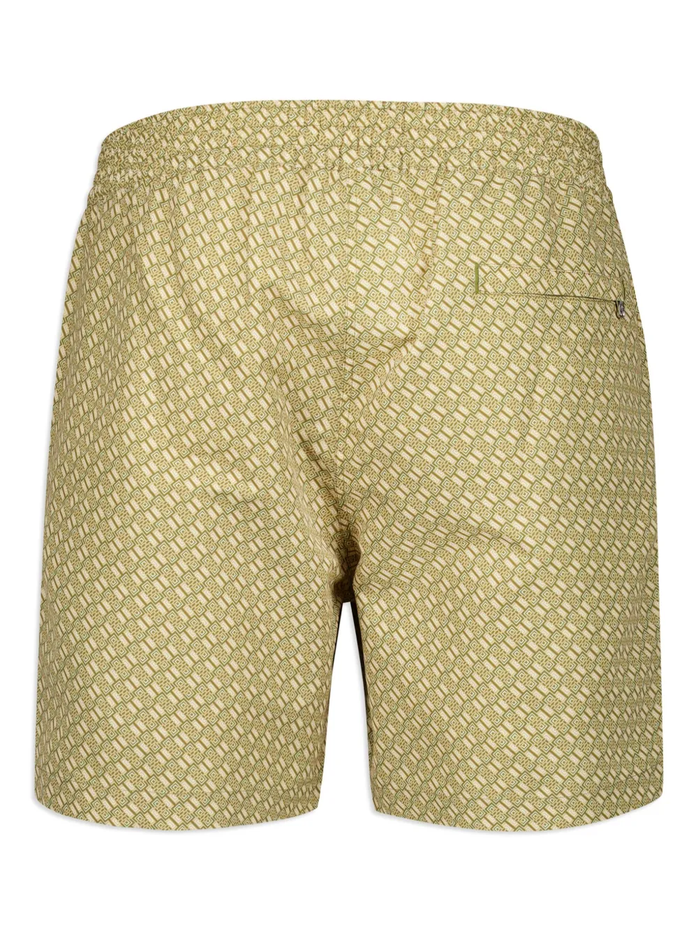 camel geel gerecycled polyester geometrische print mid waist dijlengte elastische tailleband aan de achterkant verborgen sluiting aan de voorkant steekvakken aan de zijkant achterzak met ritssluiting Zwemkleding moet over je eigen kleding worden aangepast.