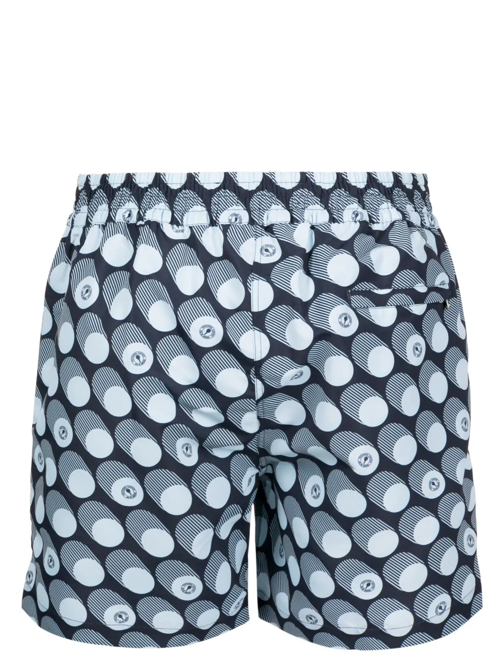 Marineblauw, lichtblauw, gerecycled polyester, stippenprint, dijlengte, elastische tailleband met trekkoord, twee ingenaaide zijzakken en paspelzak aan de achterkant. Zwemkleding moet over je eigen kleding worden aangepast.. .