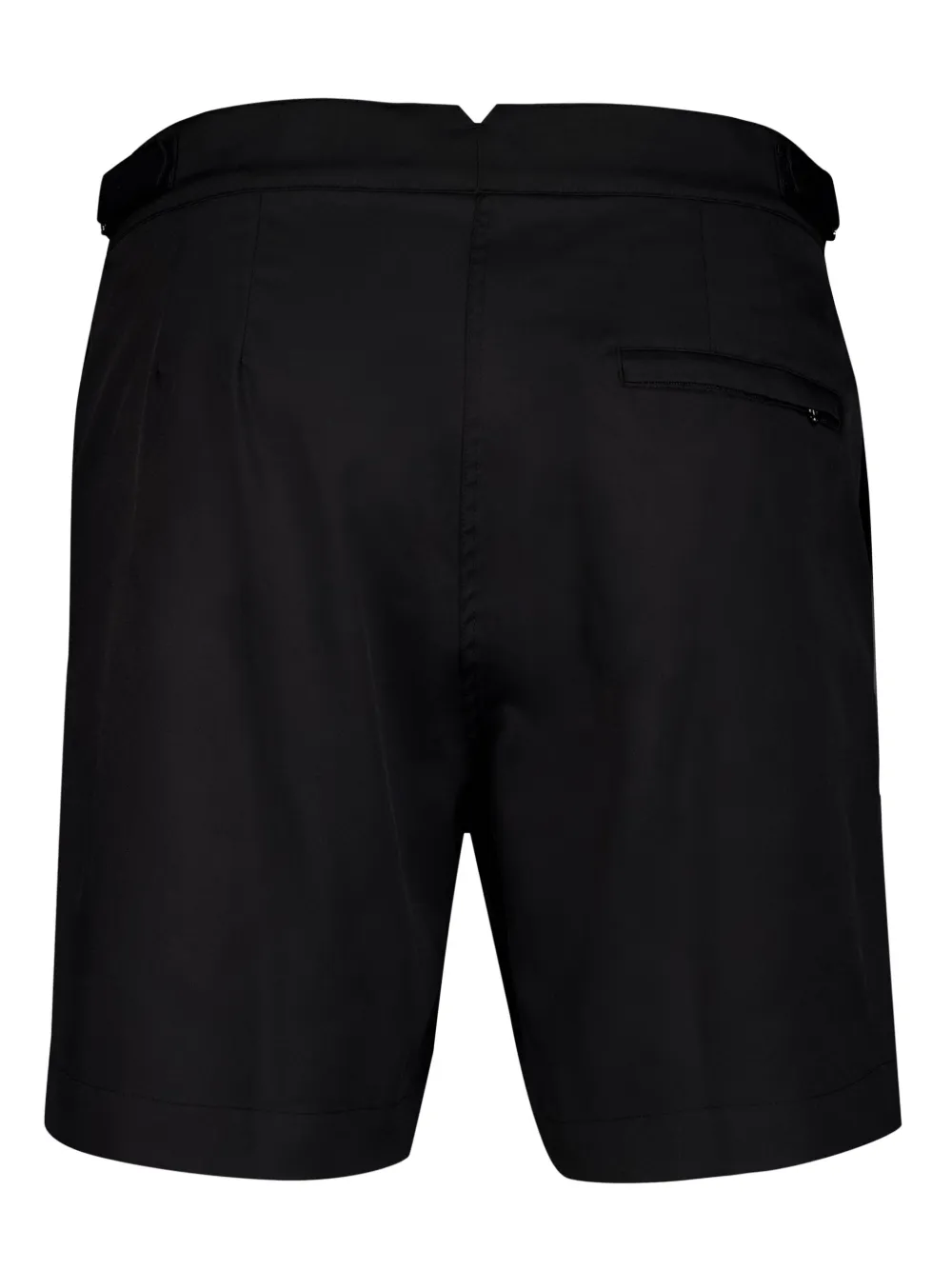 zwart knoop- en ritssluiting aan de voorkant mid waist steekvakken aan de zijkant achterzak met ritssluiting lengte tot boven de knie Zwemkleding moet over je eigen kleding worden aangepast.