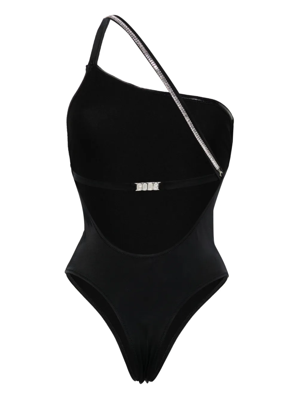 zwart stretch design asymmetrische schouder asymmetrische hals zilverkleurig logo afneembare schouderband met schakels hoog uitgesneden Zwemkleding moet over je eigen kleding worden aangepast.