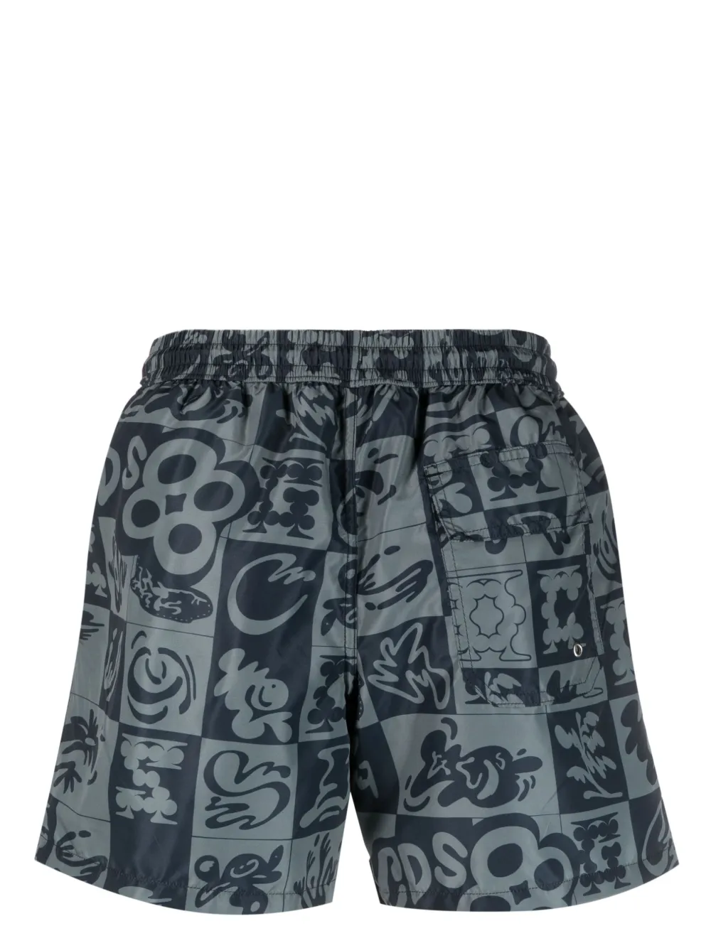 Zwart, houtskoolgrijs, all-over grafische print, schaakbordprint, elastische tailleband met trekkoord, twee steekzijzakken, opgestikt vak aan de achterkant en dijlengte. Zwemkleding moet over je eigen kleding worden aangepast..
