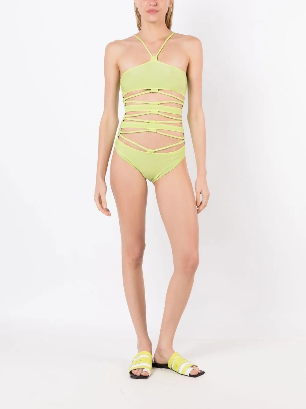 Lichtgroen, halternek striksluiting, rechte open rug en uitgesneden detail . Zwemkleding moet over je eigen kleding worden aangepast..