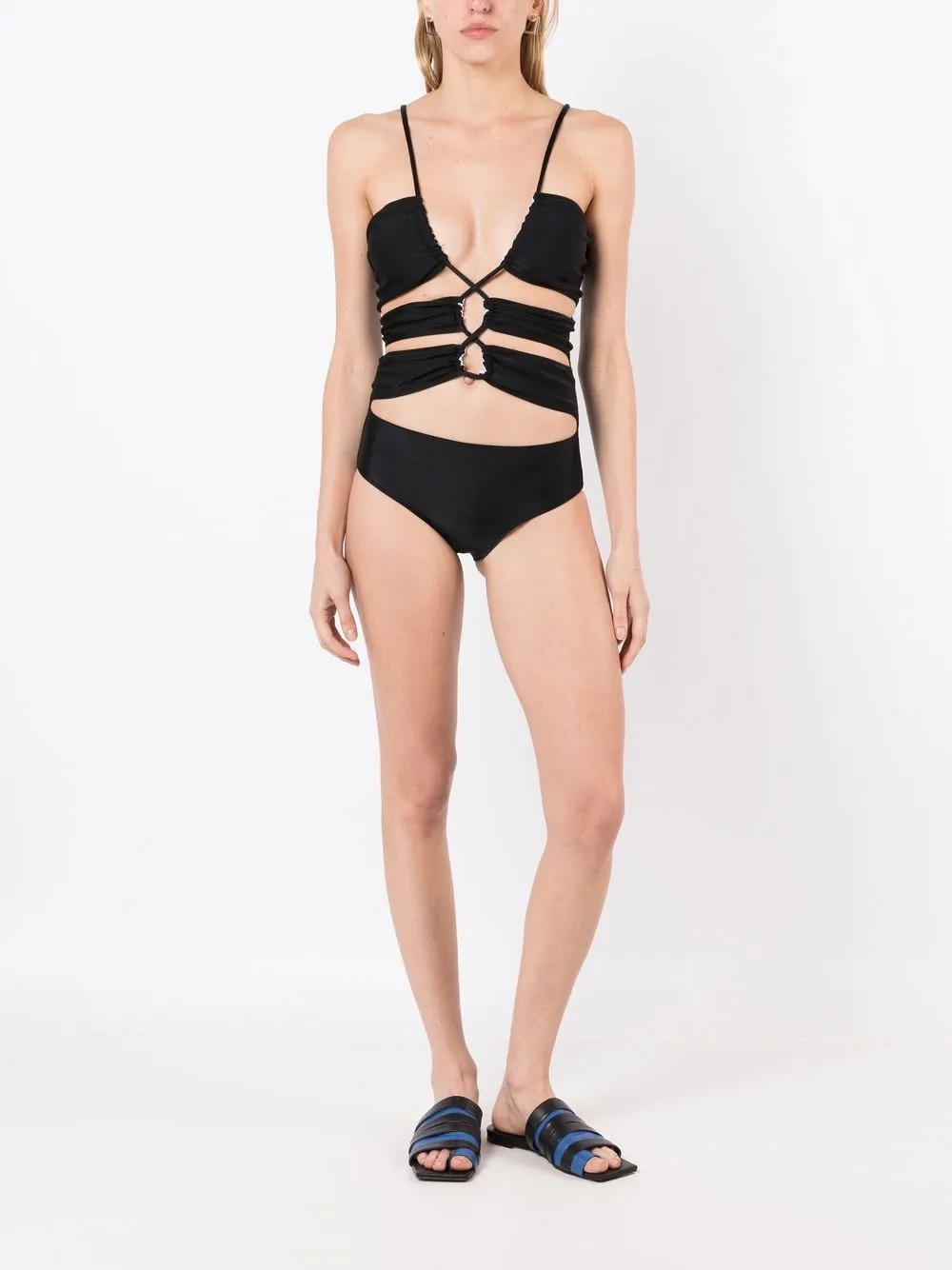 Zwart, uitgesneden detail , ruchedetails en striksluiting aan de achterkant. Zwemkleding moet over je eigen kleding worden aangepast..