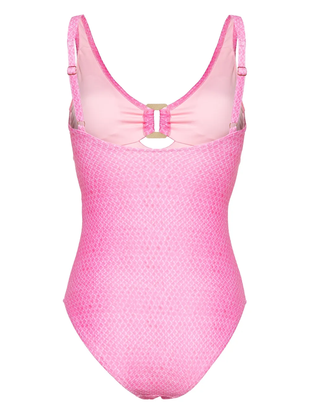 roze gerecycled polyamide stretch design getextureerde afwerking slangenprint goudkleurige hardware gesmockte details U-vormige watervalhals verstelbare schouderbandjes triangel cup uitneembare pads hoog uitgesneden volledige voering Zwemkleding moet over je eigen kleding worden aangepast.