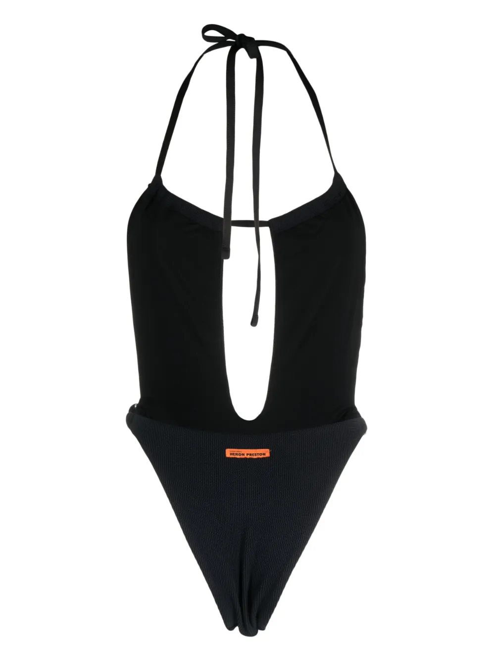 Zwart, stretch design, logopatch aan de achterkant, uitgesneden detail en halternek striksluiting. Zwemkleding moet over je eigen kleding worden aangepast..