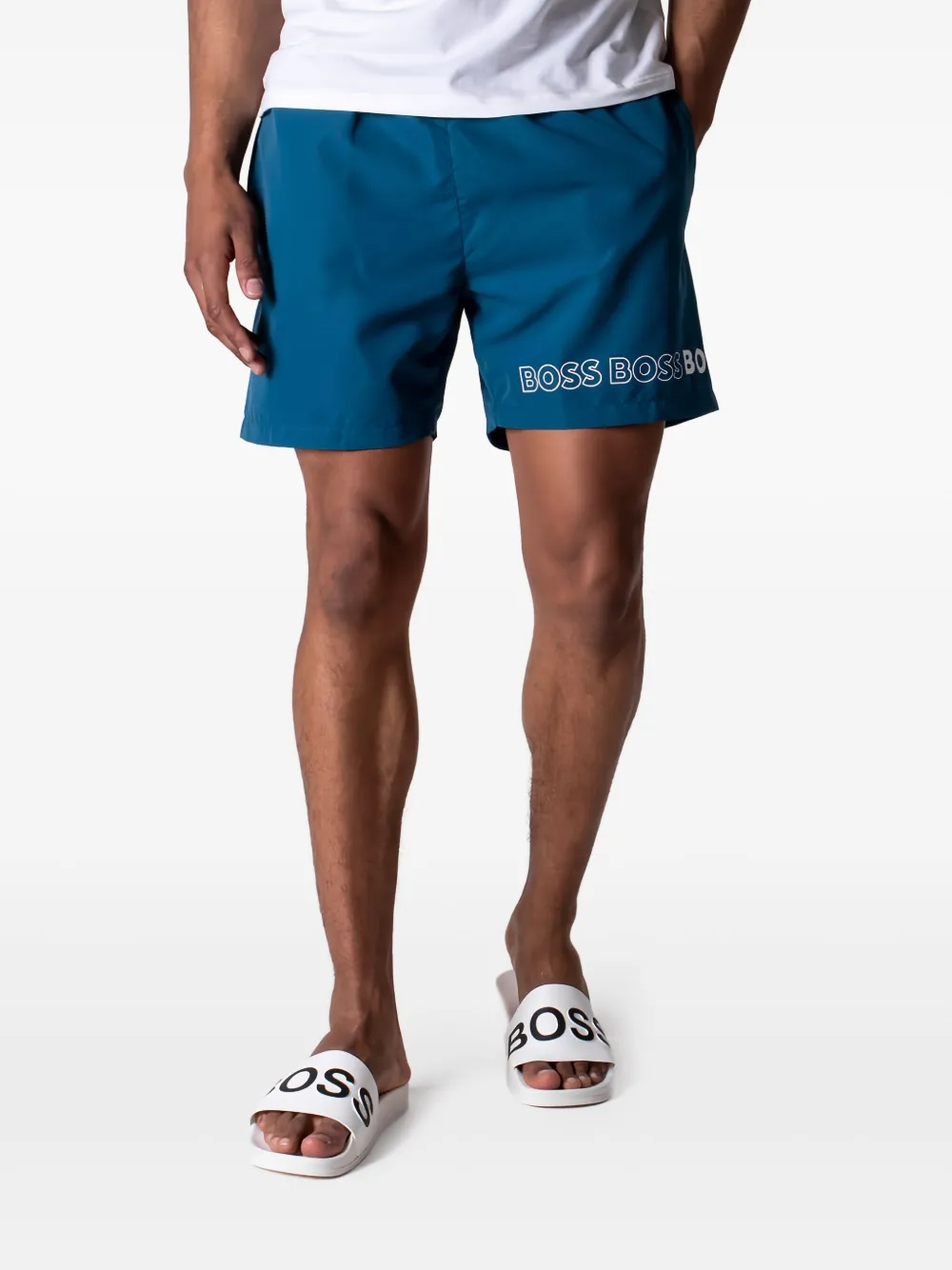 marineblauw elastische tailleband twee steekzakken aan de zijkant opgestikte zak aan de achterkant logoprint aan de zijkant Zwemkleding moet over je eigen kleding worden aangepast.