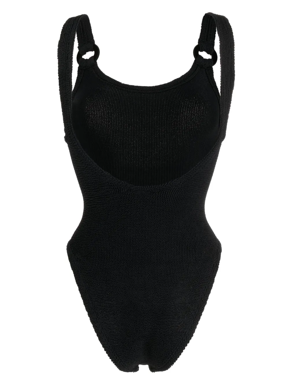 zwart stretch design badstof chunky oorring design ronde hals schouderbandjes open rug zoom afwerking ^ ^ Zwemkleding moet over je eigen kleding worden aangepast.