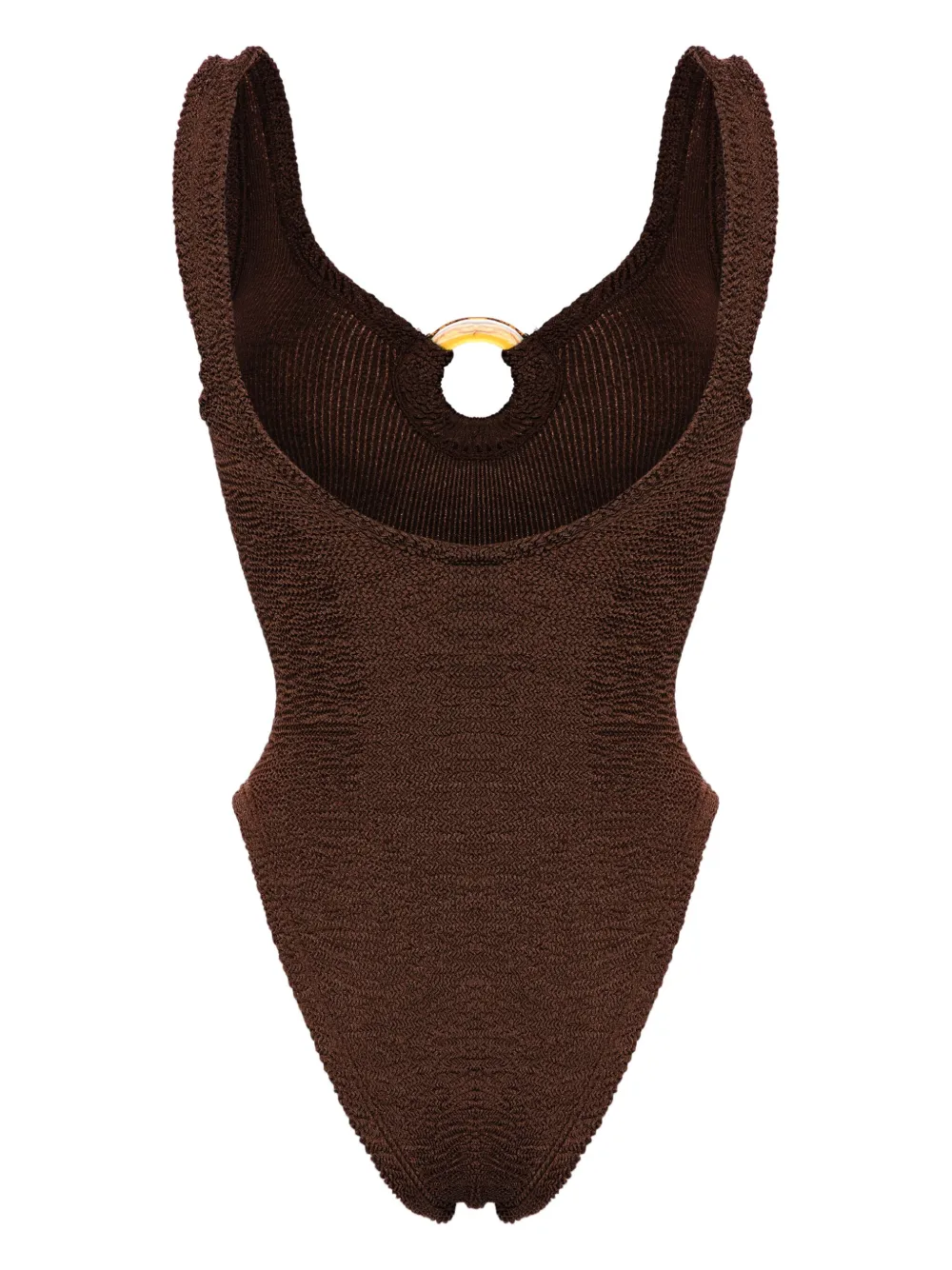 koffiebruin gekreukte afwerking stretch design uitgesneden detail schildpadschild effect U-vormige watervalhals mouwloos lage rug hoog uitgesneden ongevoerd Zwemkleding moet over je eigen kleding worden aangepast.