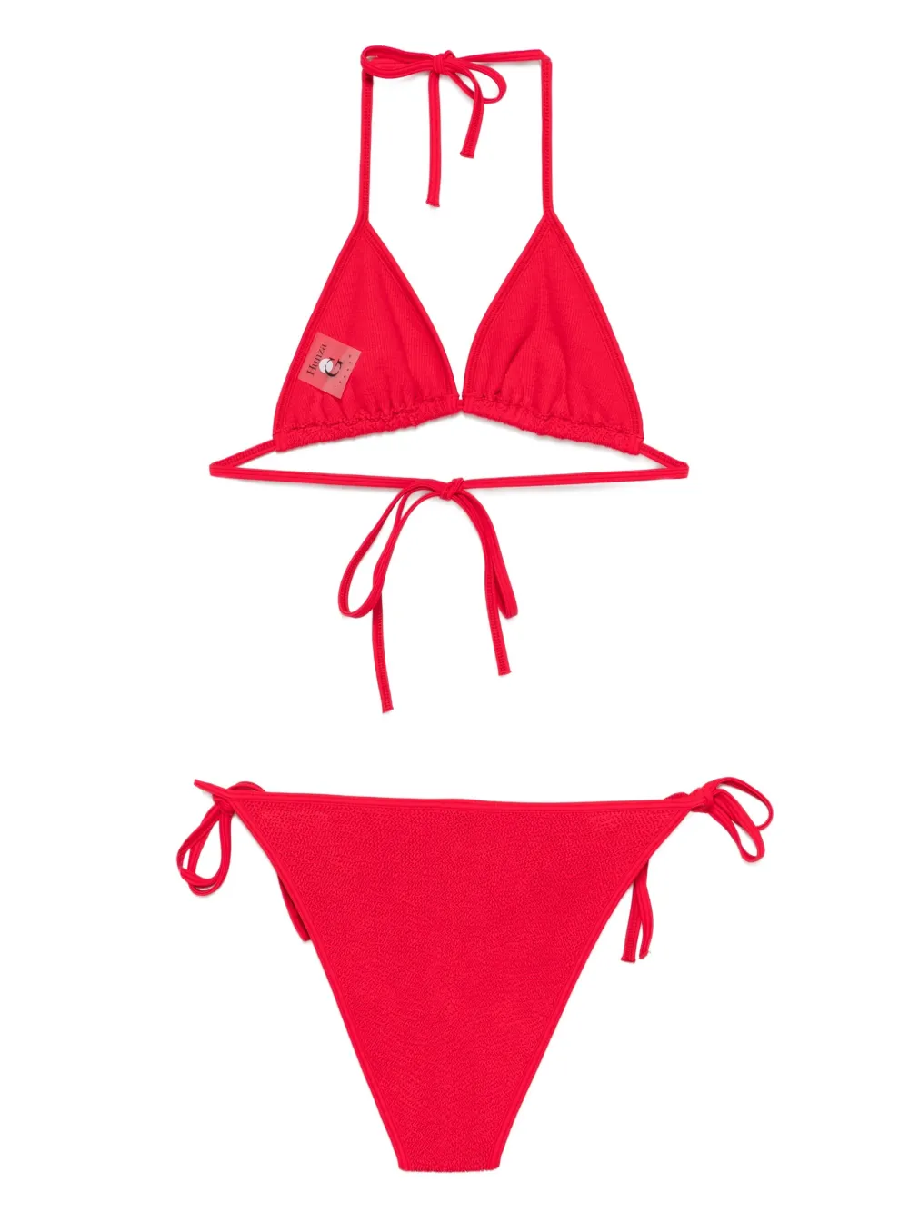helderrood halternek striksluiting bikinibroek met striksluiting aan de zijkant triangel cup Zwemkleding moet over je eigen kleding worden aangepast.