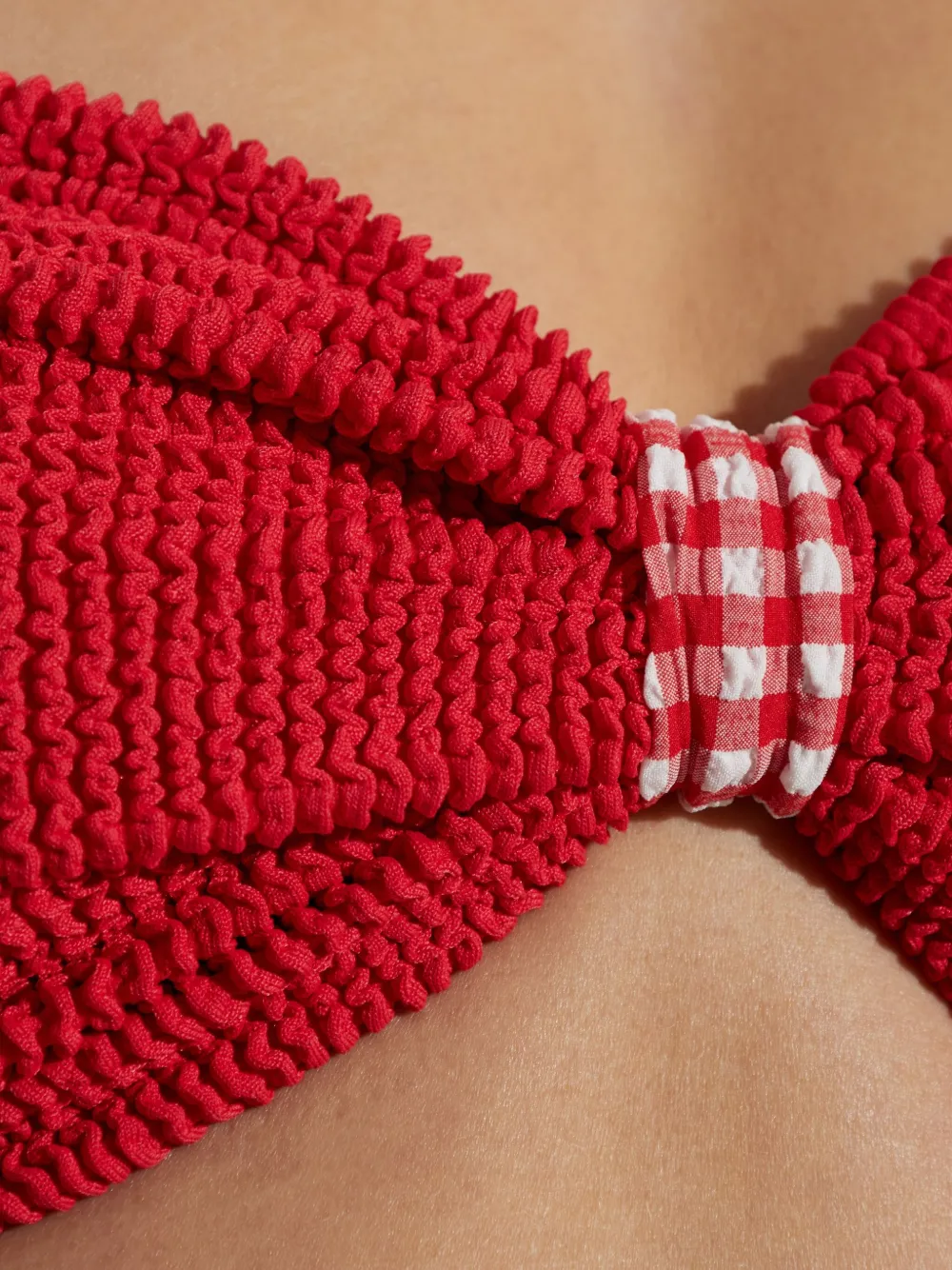rood gekreukte textuur gingham-detail bikinibroek met ruches strapless top Zwemkleding moet over je eigen kleding worden aangepast.