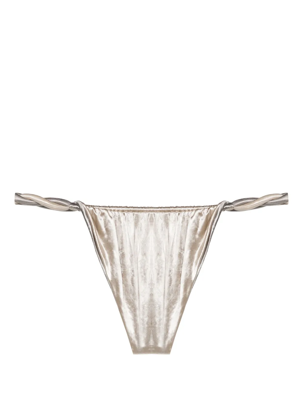 zilverkleurig satijnen afwerking stretch design tweekleurig design omkeerbaar touwdetails elastische band ruchedetails volledige voering Zwemkleding moet over je eigen kleding worden aangepast.