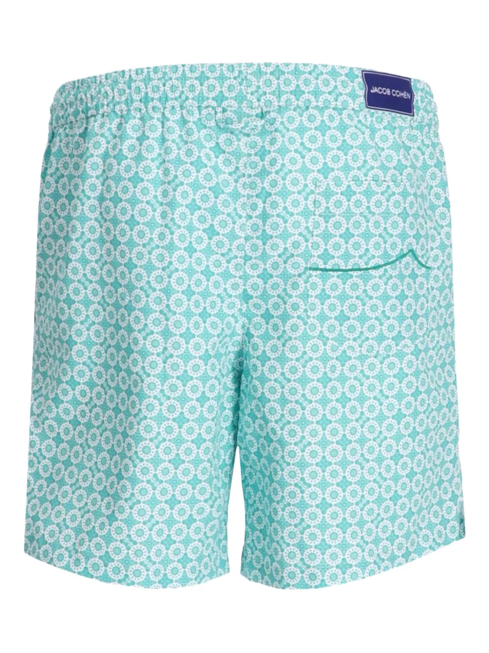 turkoois rond patroon trekkoordsluiting zijzakken achterzak groene stiksels Zwemkleding moet over je eigen kleding worden aangepast.