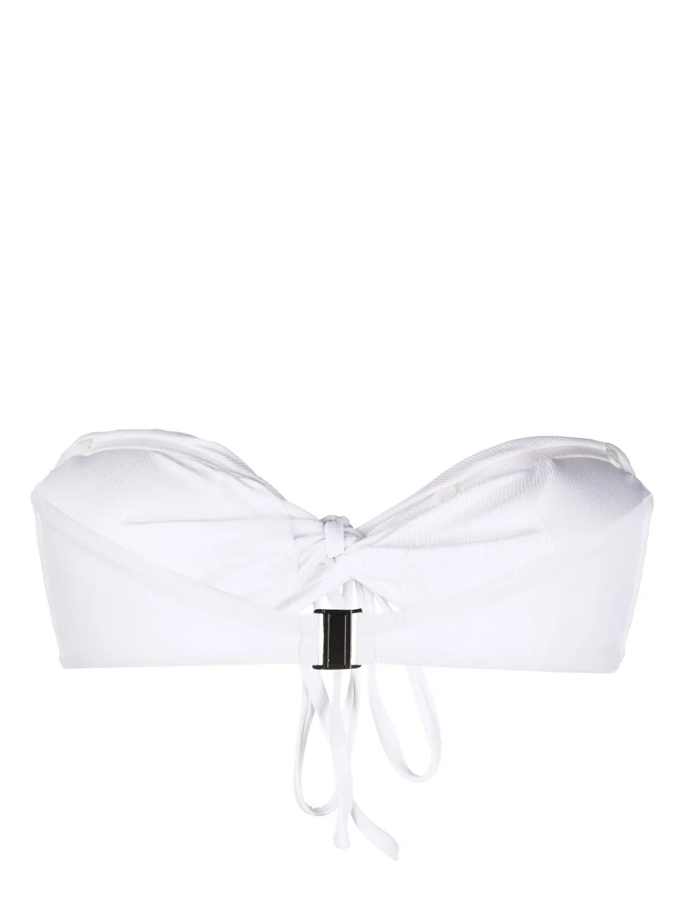 Wit, fijne ribbels, geborduurd logo op de voorkant, bandeau, voorgevormde cup, sweetheart-hals, striksluiting aan de voorkant, sluiting aan de achterkant en volledige voering. Zwemkleding moet over je eigen kleding worden aangepast..