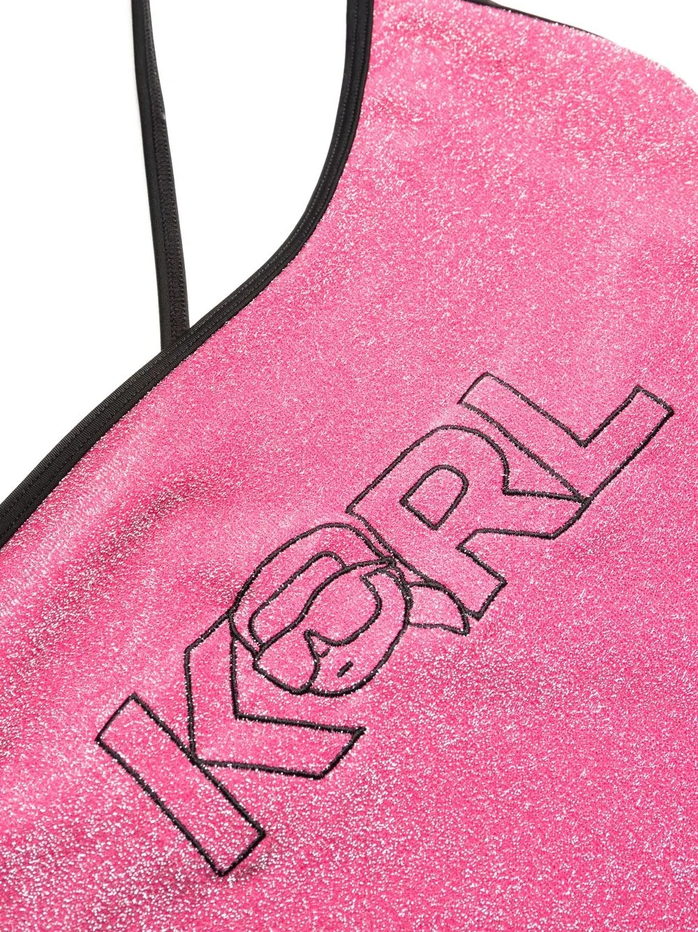 Zwart, roze, stretch design, metallic garen, asymmetrisch design, lurex details, glitterdetails, contrasterende afwerking, logoprint op de voorkant en asymmetrische schouder. Zwemkleding moet over je eigen kleding worden aangepast..