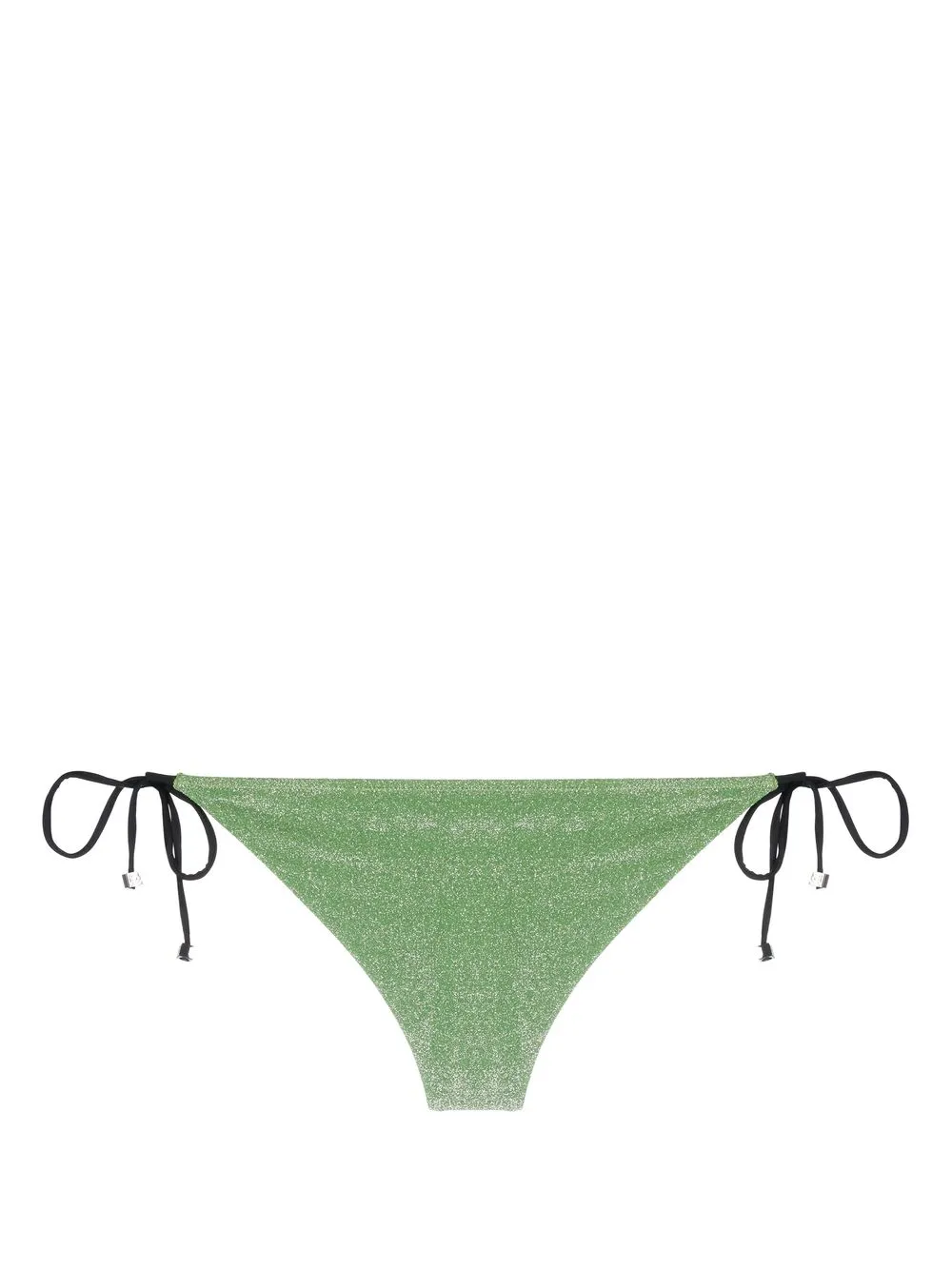 Avocadogroen, metallic finish, bikinislip met striksluiting aan de zijkant, low waist en logoprint aan de zijkant. Zwemkleding moet over je eigen kleding worden aangepast..