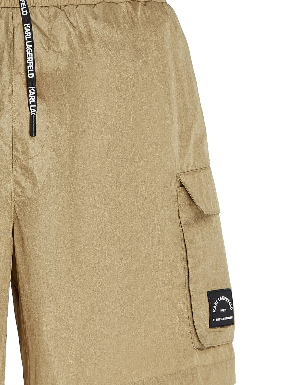 beige logo applicatie trekkoord met logoprint elastische tailleband met trekkoord twee ingenaaide zijzakken klepzakken aan de zijkant paspelzak aan de achterkant rechte zoom Zwemkleding moet over je eigen kleding worden aangepast.