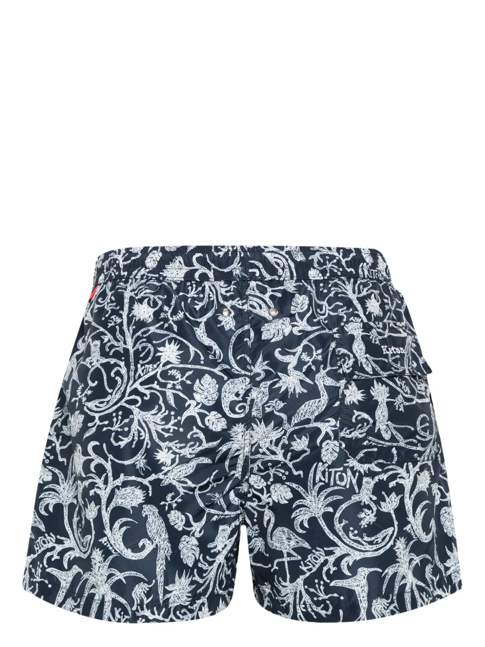 nachtblauw all-over grafische print twee ingenaaide zijzakken vakje voor muntgeld knopen met gegraveerd logo korte zijsplitten klepzak aan de achterzijde geborduurd logo aan de achterkant ringlets detail logolabel aan de binnenkant inwendige mesh slip elastische tailleband met trekkoord Zwemkleding moet over je eigen kleding worden aangepast.