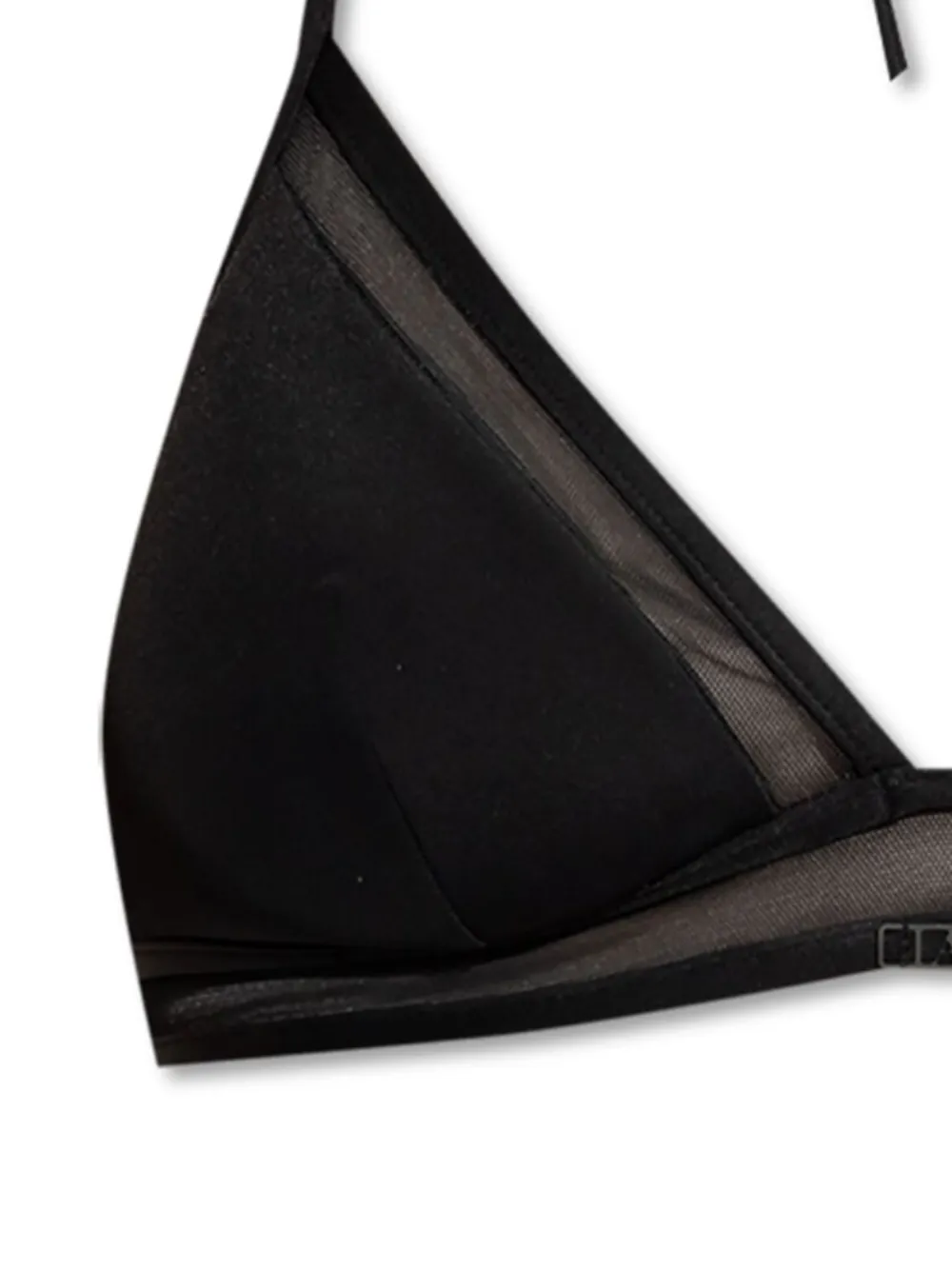 zwart stretch design mesh vlakken effen logoplakkaat triangel cup halternek striksluiting sluiting aan de achterkant elastische band Zwemkleding moet over je eigen kleding worden aangepast.
