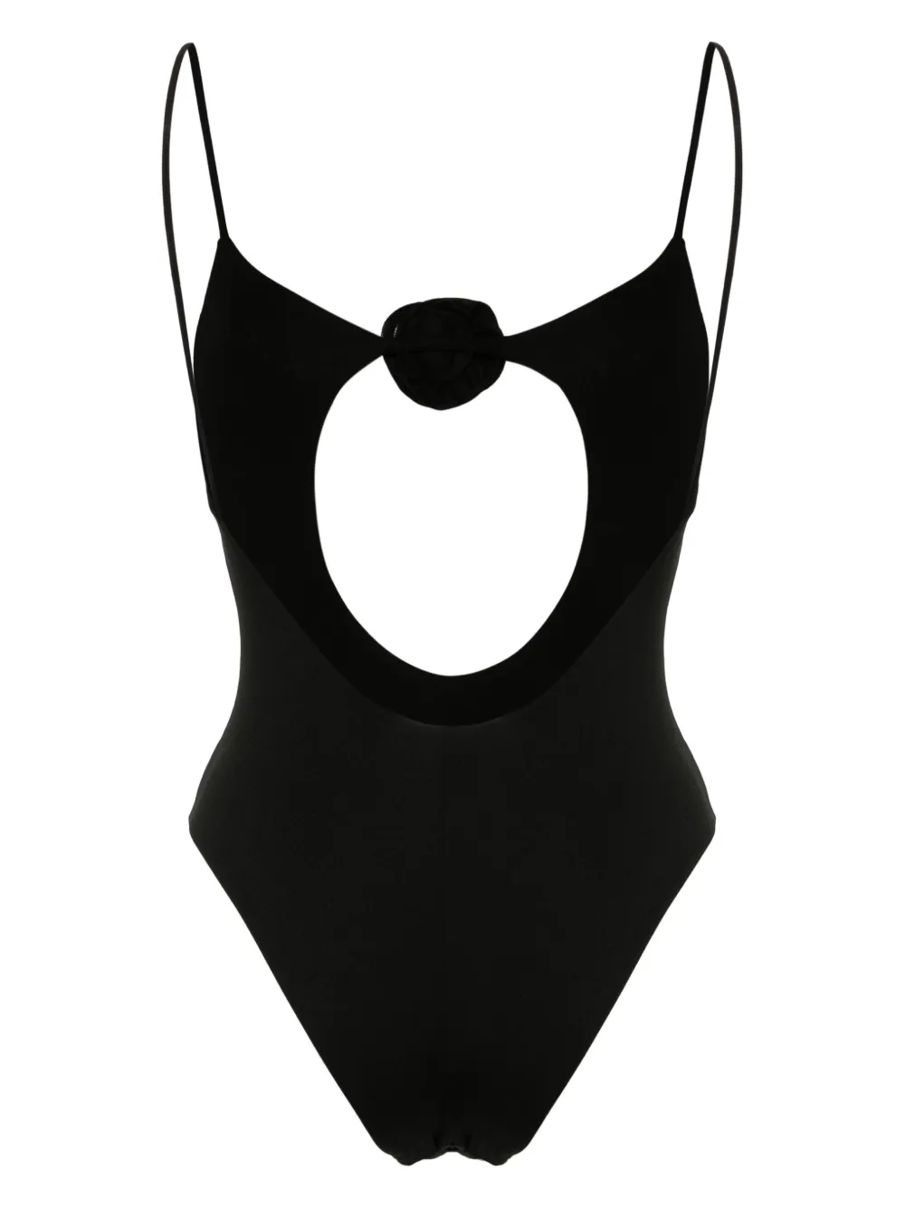 zwart stretch design bloemenpatch uitgesneden detail ronde hals spaghettibandjes open rug hoog uitgesneden Zwemkleding moet over je eigen kleding worden aangepast.