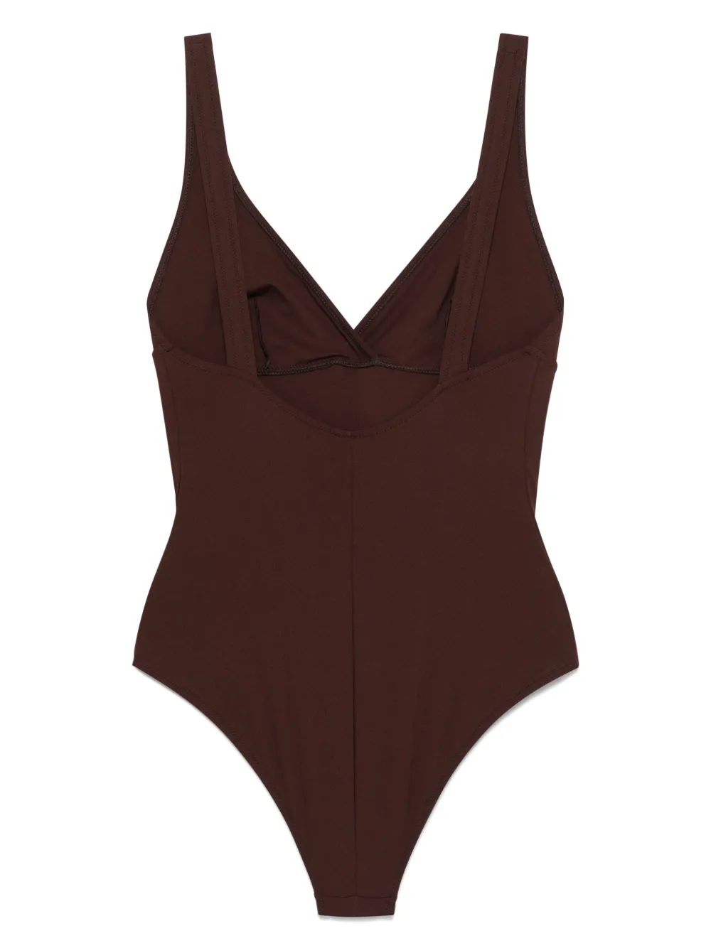 walnootbruin V-hals twee platte schouderbandjes laag uitgesneden rug Zwemkleding moet over je eigen kleding worden aangepast.