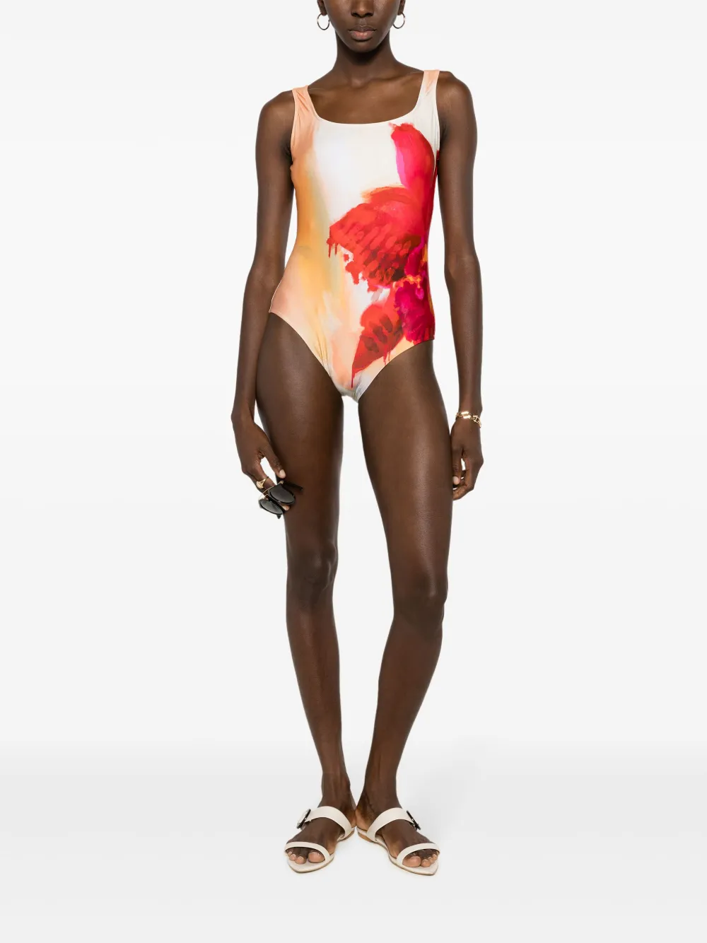 Klaproosrood, veelkleurig, stretch design, bloemenprint, ronde hals, open rug en onesie design. Zwemkleding moet over je eigen kleding worden aangepast..