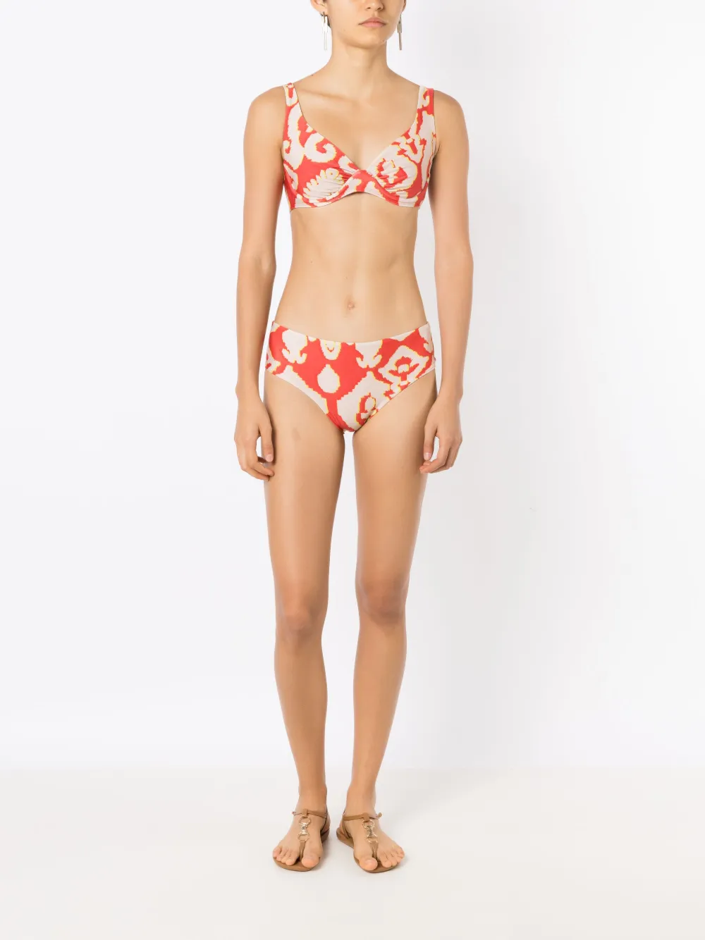 All-over grafische print, gesmockte details, triangel cup, V-hals, mouwloos en haak- en oogsluiting aan de achterkant. Zwemkleding moet over je eigen kleding worden aangepast..