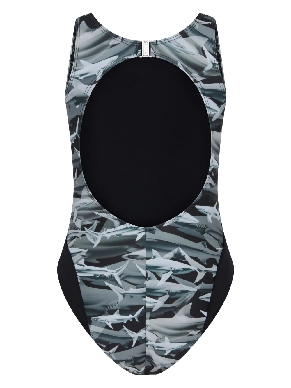 antraciet grijs stretch ECONYL® sluiting aan de achterkantZwembroek met haaienprint camouflageprint ronde hals logoprint op de voorkant mouwloos open rug Zwemkleding moet over je eigen kleding worden aangepast.