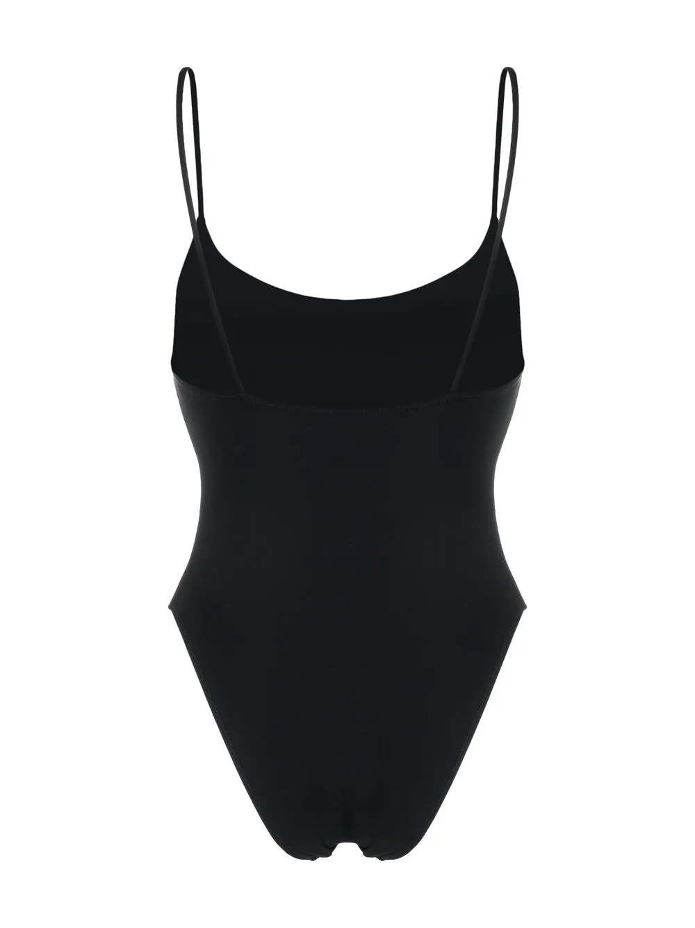 Gitzwart, stretch design, U-hals en mouwloos. Zwemkleding moet over je eigen kleding worden aangepast..