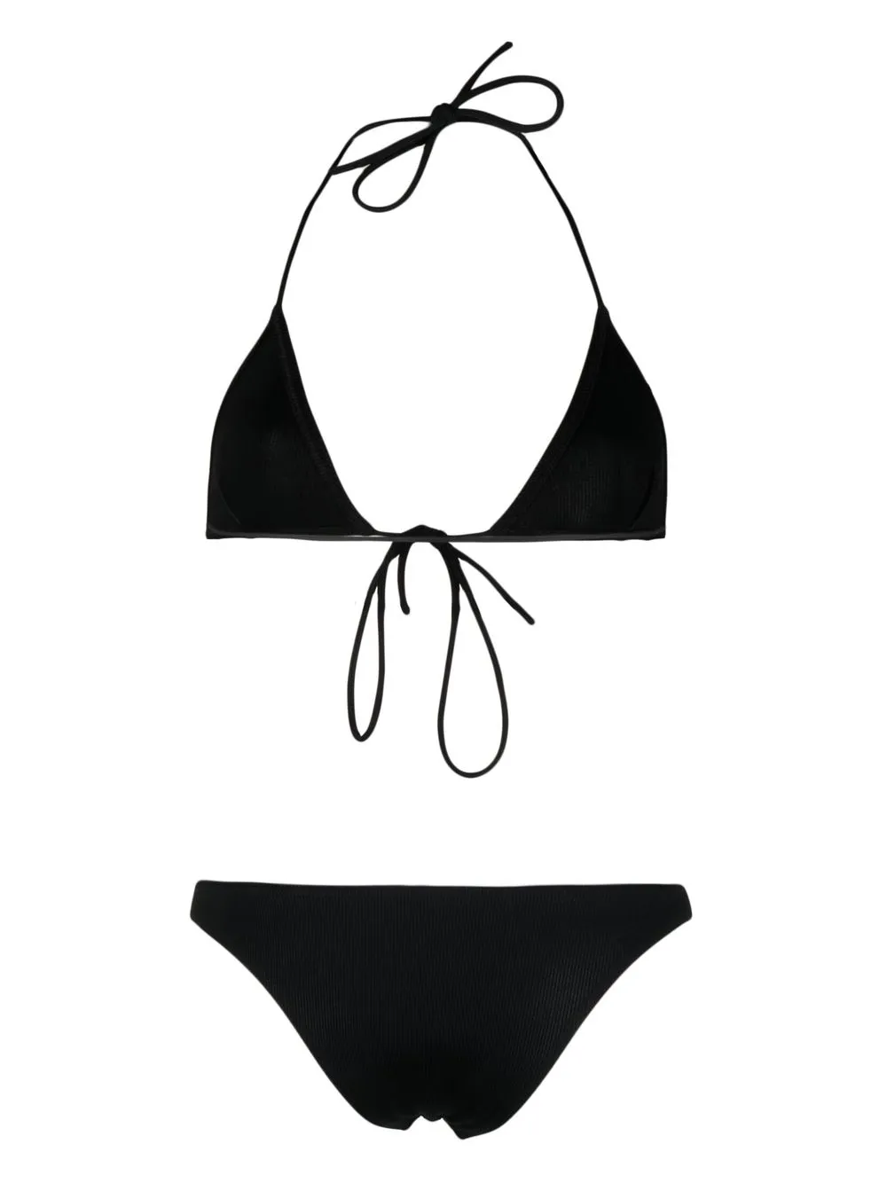 Zwart, stretch design, ribgebreid, triangel cup, verstelbare pasvorm, striksluiting aan de voorkant en mid waist. Zwemkleding moet over je eigen kleding worden aangepast..