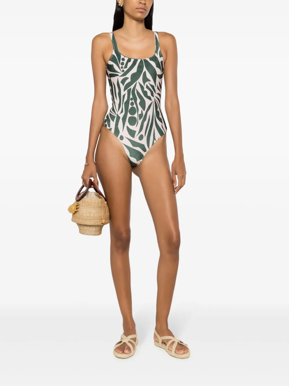 Jadegroen, crèmewit, stretch design, abstract patroon, ronde hals, laag uitgesneden rug, dunne schouderbandjes, banddetail, Braziliaanse stijl en volledige voering. Zwemkleding moet over je eigen kleding worden aangepast..