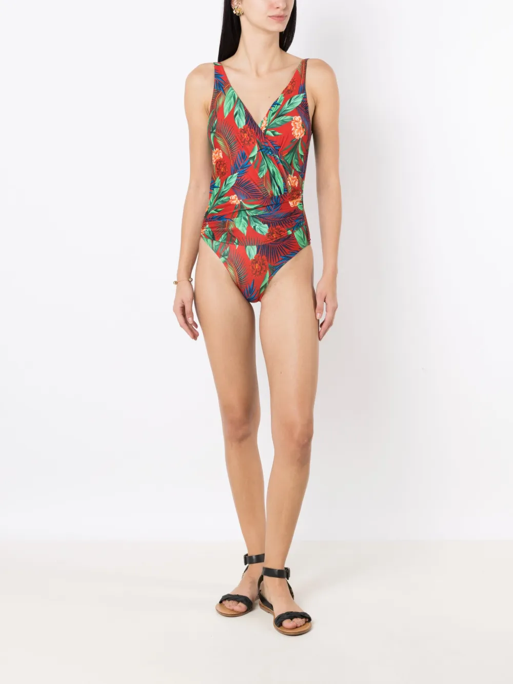 Stretch design, all-over bloemenprint, ruchedetails, V-hals, dunne schouderbandjes, mouwloos en open rug. Zwemkleding moet over je eigen kleding worden aangepast..