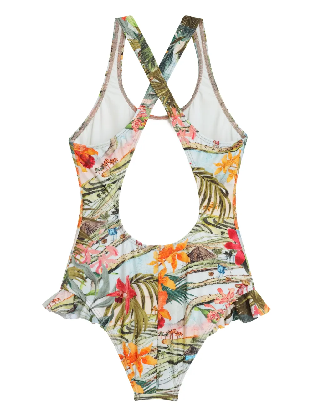 lichtblauw bloemenprint ruches gekruiste schouderbandjes open rug Zwemkleding moet over je eigen kleding worden aangepast.