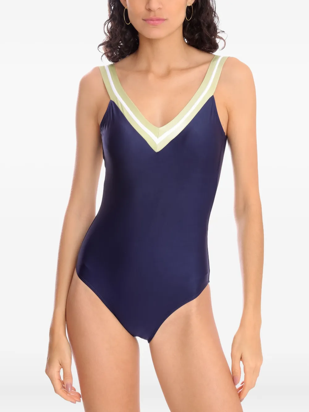 blauw V-hals groene bandjes Zwemkleding moet over je eigen kleding worden aangepast.