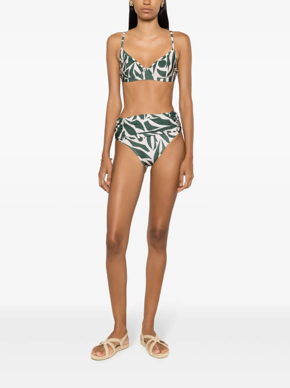 Jadegroen, crèmewit, stretch design, abstract patroon, balconette stijl, beugelbeha, verstelbare spaghettibandjes, sluiting aan de achterkant, gedrapeerd detail, high waist bikinislip en volledige voering. Zwemkleding moet over je eigen kleding worden aangepast..