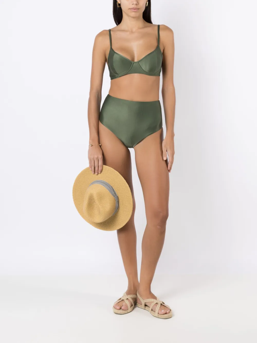 Olijfgroen, stretch design, goudkleurig materiaal, verstelbare spaghettibandjes, voorgevormde cup, beugelbeha en gespsluiting aan de achterkant. Zwemkleding moet over je eigen kleding worden aangepast..