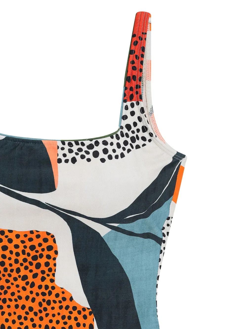 oranje/veelkleurig stretch design abstract patroon dunne schouderbandjes ronde hals uitneembare pads verstelbaar bandje aan de achterkant lage rug Zwemkleding moet over je eigen kleding worden aangepast.