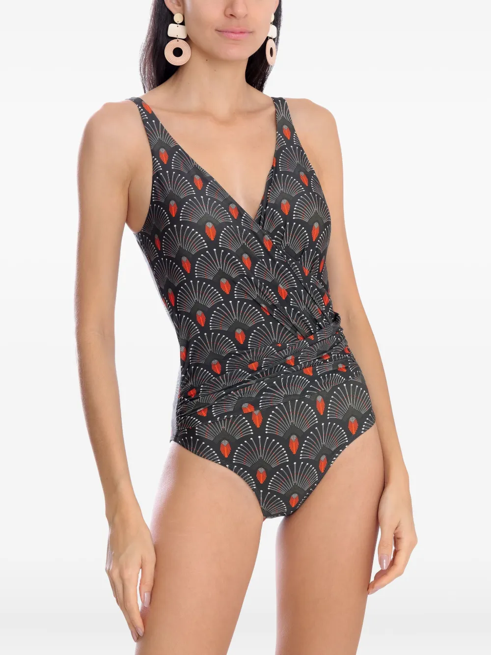 zwart design met bloemenprint V-hals gelaagde details open rug Zwemkleding moet over je eigen kleding worden aangepast.