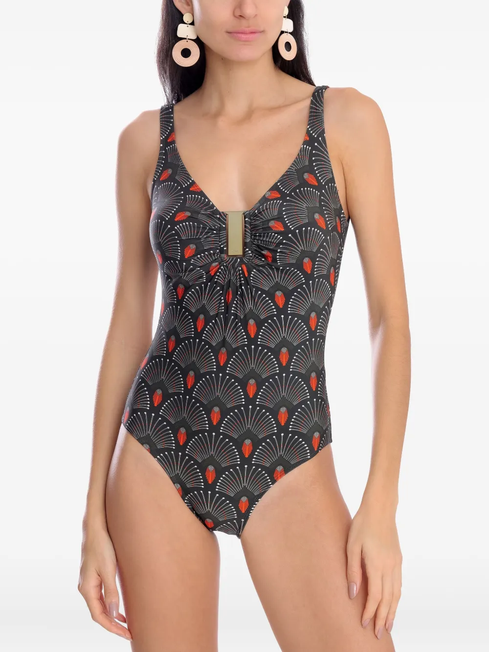zwart geometrisch patroon gesmockt midden V-hals afneembaar halskoord Zwemkleding moet over je eigen kleding worden aangepast.