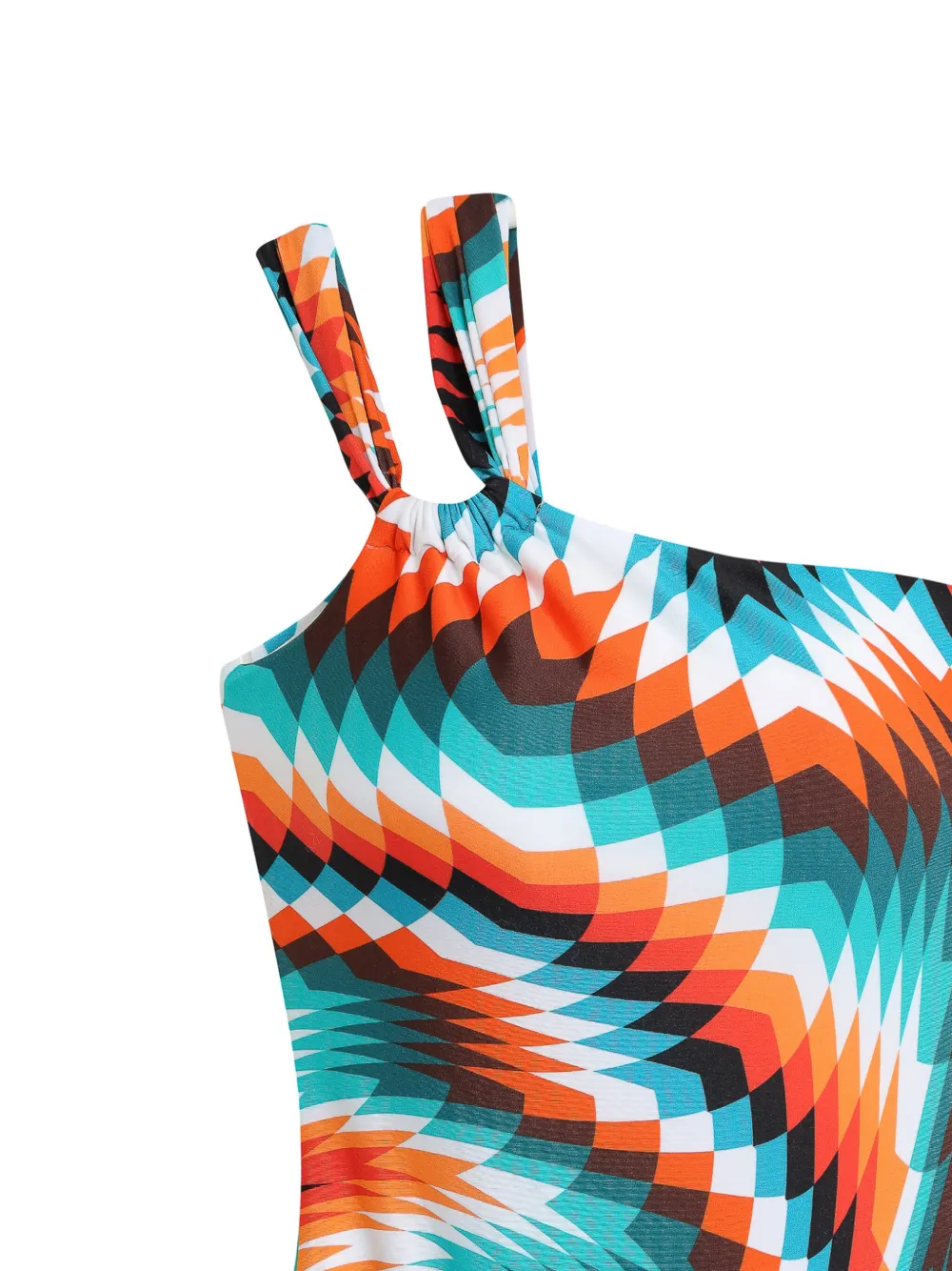 blauw/oranje/wit geometrisch patroon asymmetrische schouder instapmodel Zwemkleding moet over je eigen kleding worden aangepast.