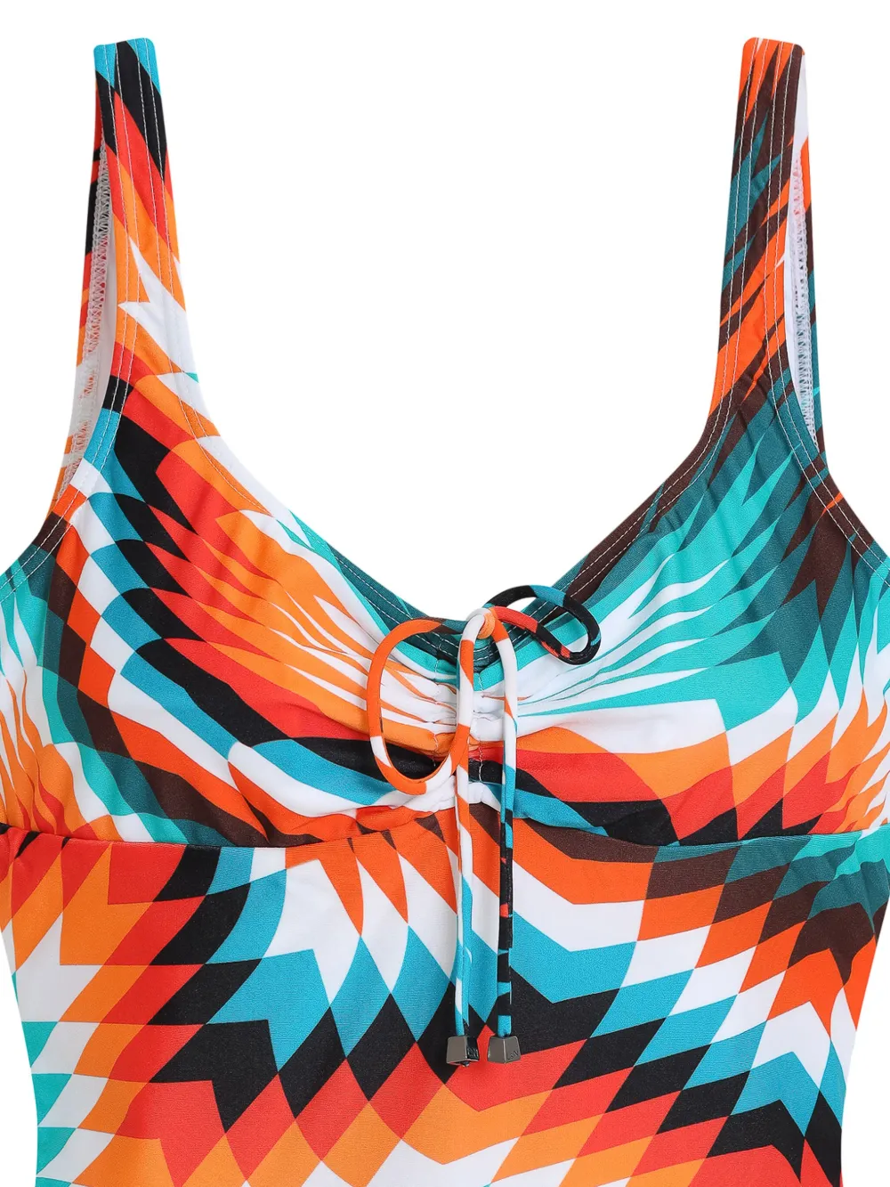 oranje/blauw/wit geometrisch patroon klittenbandsluiting aan de voorkant open rug Zwemkleding moet over je eigen kleding worden aangepast.