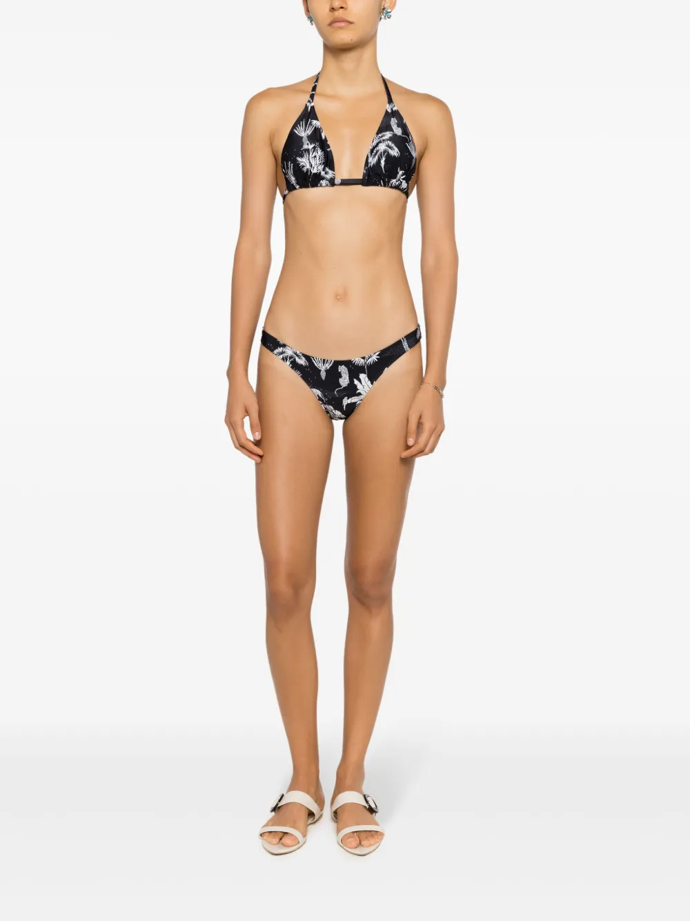 Zwart/wit, stretch design, botanische print, triangel cup, uitneembare pads, UV-bescherming, halternek striksluiting, striksluiting aan de achterkant en volledige voering. Zwemkleding moet over je eigen kleding worden aangepast..