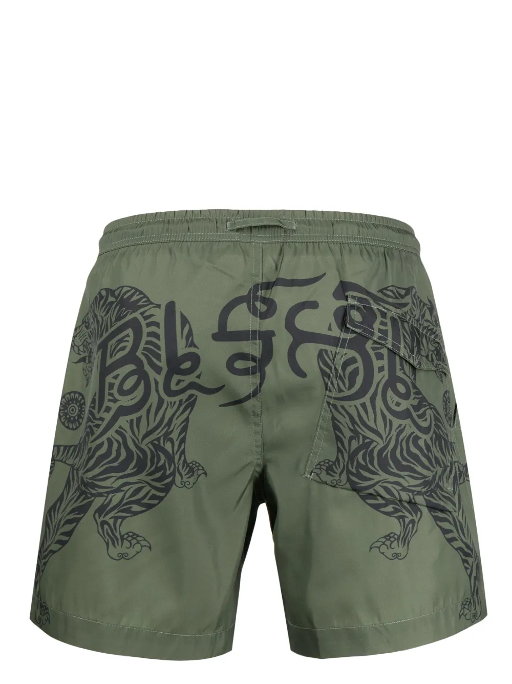 Olijfgroen, zwart, gerecycled polyester, tijgerprint, elastische tailleband met trekkoord, twee ingenaaide zijzakken en achterzak met klep. Zwemkleding moet over je eigen kleding worden aangepast.. .